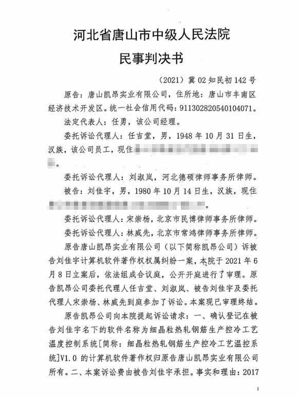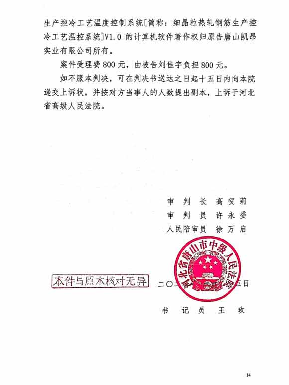 自我公司成立以来,由我公司独立自主开发的应用于控轧控冷工艺的“智能化温度自动控制系统”软件一直是我公司的产品亮点。近期由于个人利益关系,此套软件权益受到侵害,我公司利用法律武器,经河北高院终审判决,明确了我公司为此套软件的唯一拥有者。特告知业内,谨防纠纷!